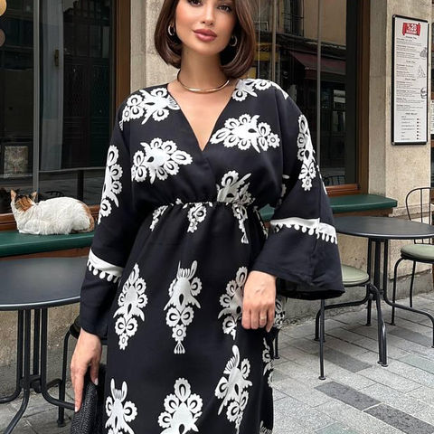 Kaliteli ve uygun fiyatlı Yırtmaç Detaylı Yarasa Kol Kruvaze Yaka Uzun Yazlık Elbise